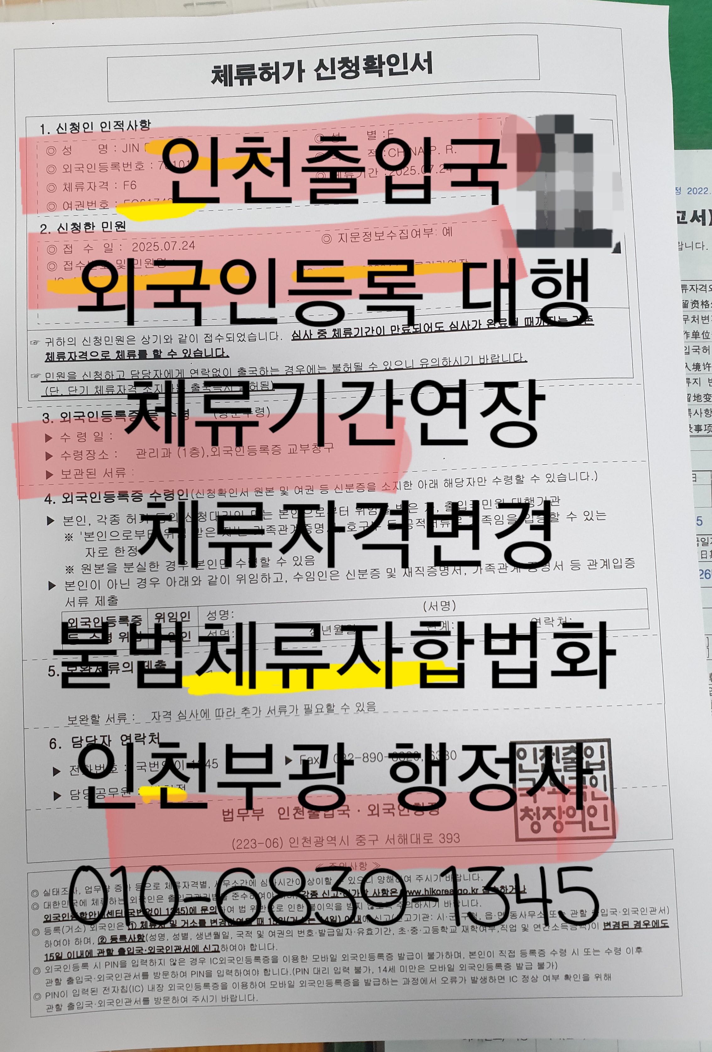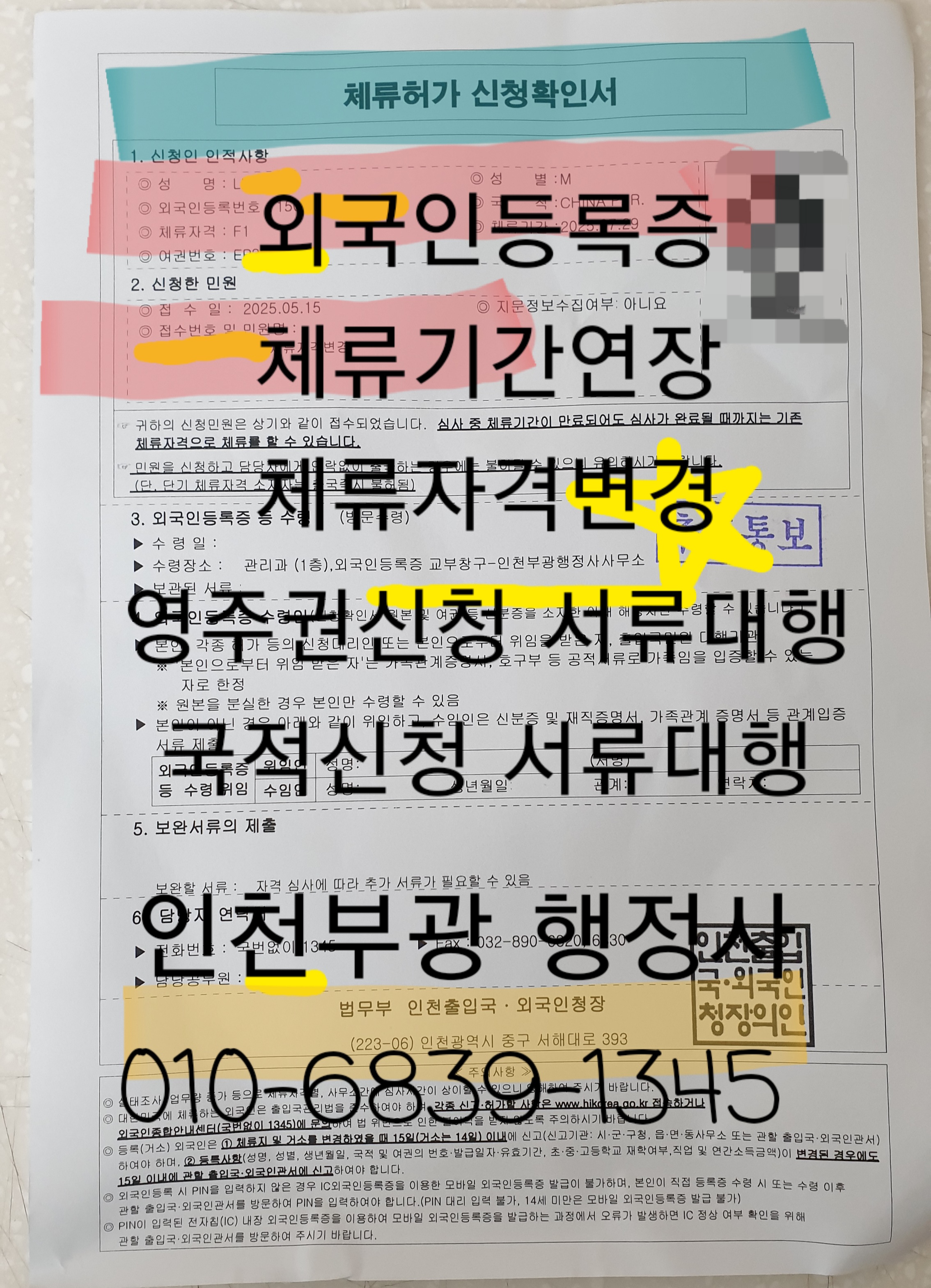 | 인천 부천 출입국 외국인등록증 체류기간연장 체류자격변경 영주권신청 국적신청 불법체류자 서류대행 (0) | 2025.07.24 |